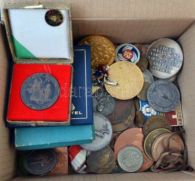 Kis doboznyi vegyes külföldi emlékérem és jelvény tétel, közte hamis pénz is T:vegyes
