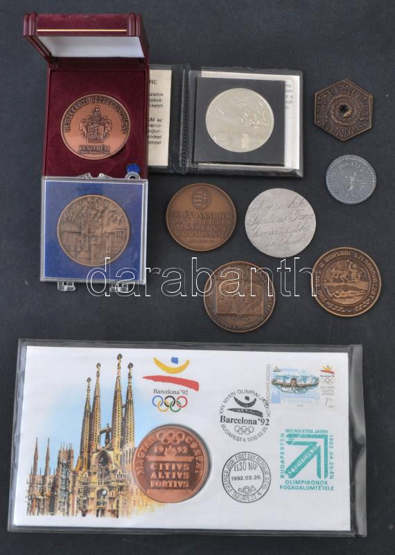 Leírás: 10db-os vegyes magyar emlékérem tétel, közte 1986. "200 éves a borsodi szénbányászat / 1786-1986" Br emlékérem (42,5mm), 1992. "Barcelona-magyar csapat" emlékérem bélyeges borítékon, elsőnapi bélyegzéssel T:PP,2,2-
