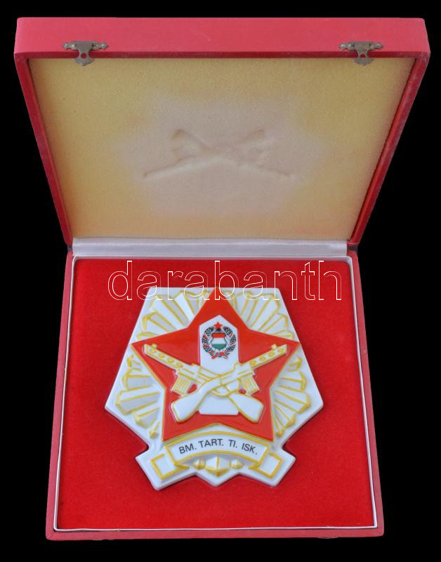 Leírás: ~1970. "BM Tartalékos Tisztképző Iskola" jelzett hollóházi porcelán emlékplakett eredeti dísztokban (158x150mm) T:1-