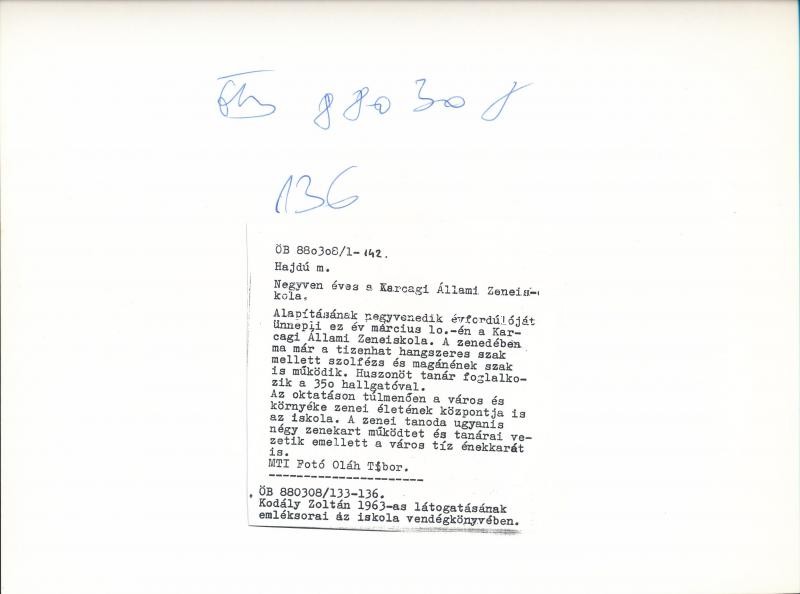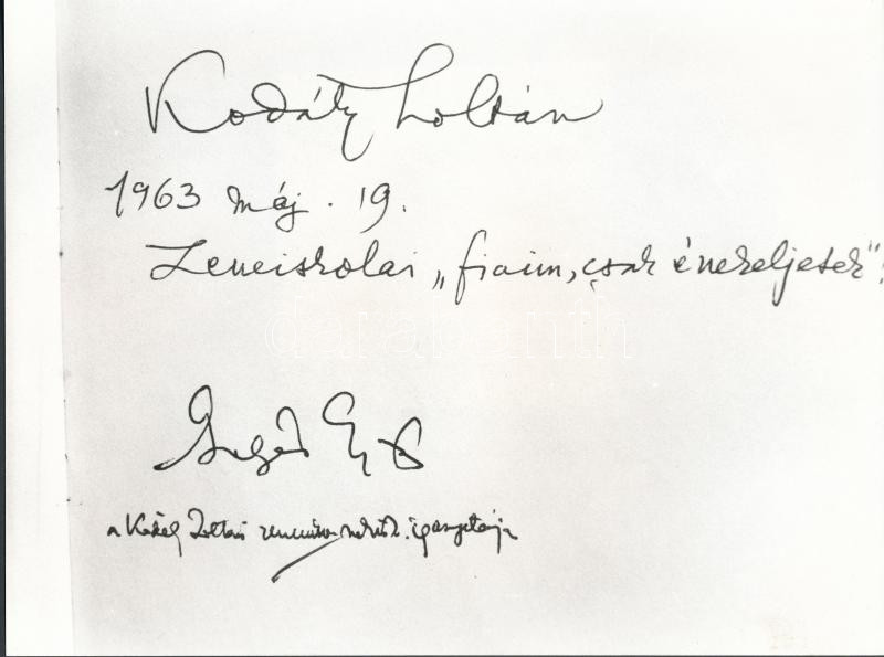 1963 május 19. Karcag, Kodály Zoltán bejegyzése a karcagi Állami Zeneiskola vendégkönyvébe, amelyet meglátogatott, MTI fotómásolat feliratozva, 18x24 cm