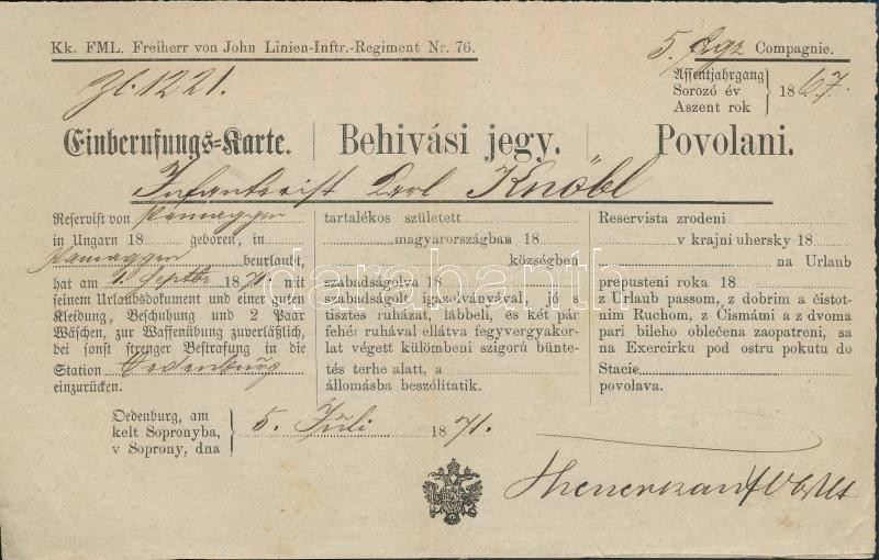 Leírás: 1871 Katonai behívójegy, Sopron, német, magyar és horvát nyelven, szép állapotban, 12x19cm