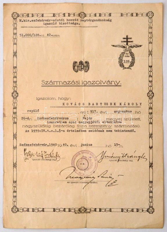 Leírás: 1940 Székesfehérvár, M. kir. székesfehérvár-sóstói honvéd reptérgondnokság igazoló bizottsága által repülős számára kiállított származási igazolvány