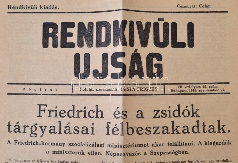 Leírás: 1919 A Rendkívüli újság szeptember 27-i száma a zavaros idők híreivel