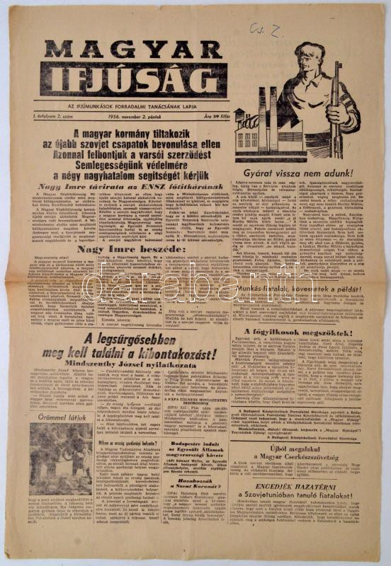 Leírás: 1956 november 2. Magyar Ifjúság, Az Ifjúmunkások Forradalmi Tanácsának Lapja,kis szakadással, pp.:2, 46x31cm