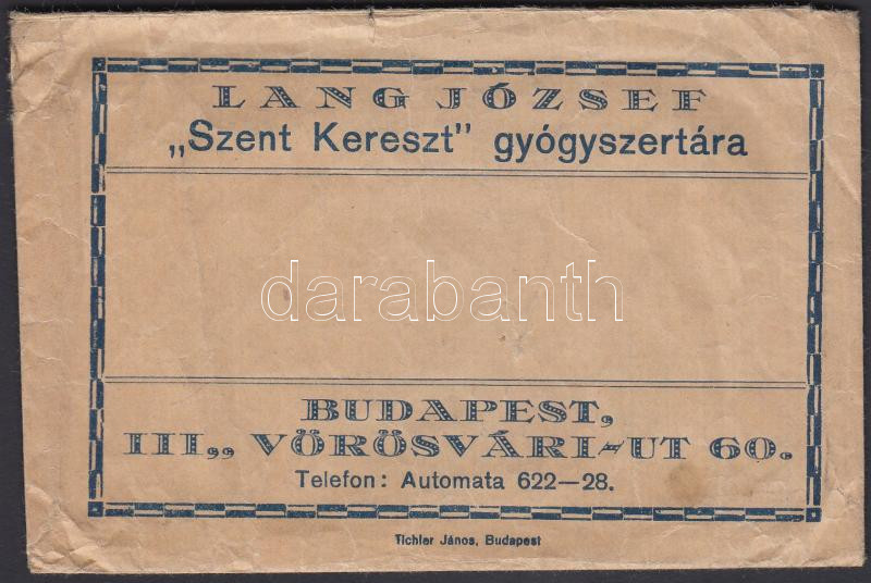 Leírás: cca 1930 Lang József "Szent Kereszt" gyógyszertára receptboríték kis szakadással, 8x12cm