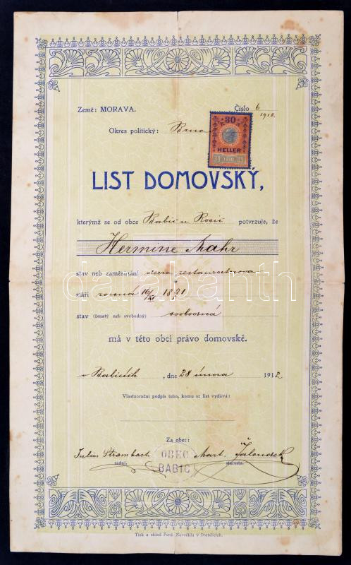 1912 Cseh nyelvű lakhelyigazolás Babice u Rosic-beli lakos részére, 30... https://www.darabanth.com/hu/271-Gyorsarveres/271.0/Festmeny-mutargy-papirregiseg-egyeb/Okmanyok~17/1912-Cseh-nyelvu-lakhelyigazolas-Babice-u-Rosic-beli-lakos-reszere-30-helleres-okmanybelyegge~II1368976