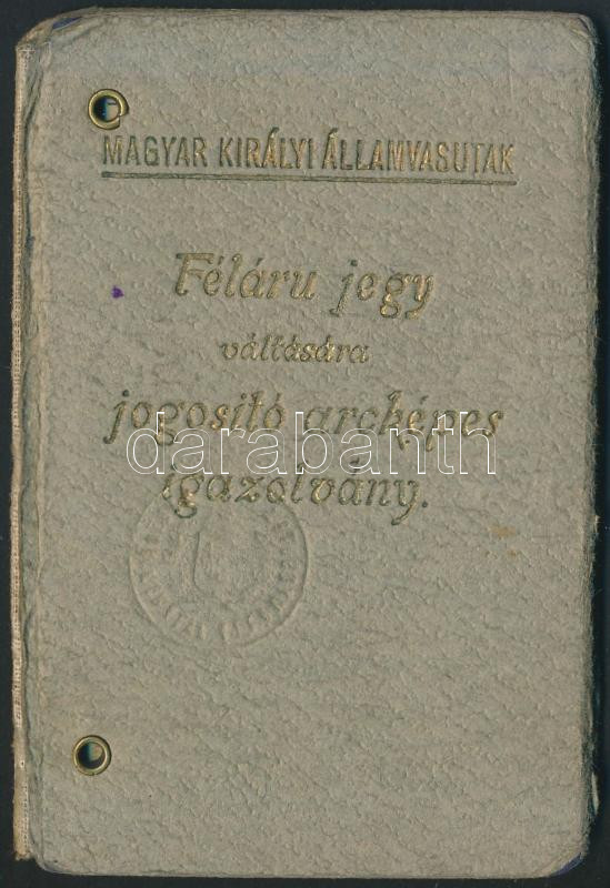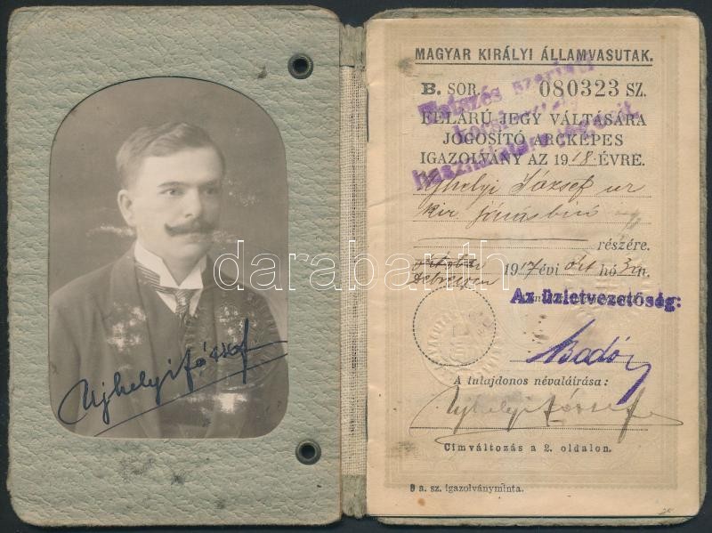 1917 Félárú jegyváltásra jogosító fényképes MÁV-igazolvány királyi jár... https://www.darabanth.com/hu/271-Gyorsarveres/271.0/Festmeny-mutargy-papirregiseg-egyeb/Okmanyok~17/1917-Felaru-jegyvaltasra-jogosito-fenykepes-MAV-igazolvany-kiralyi-jarasbiro-keso~II1248251