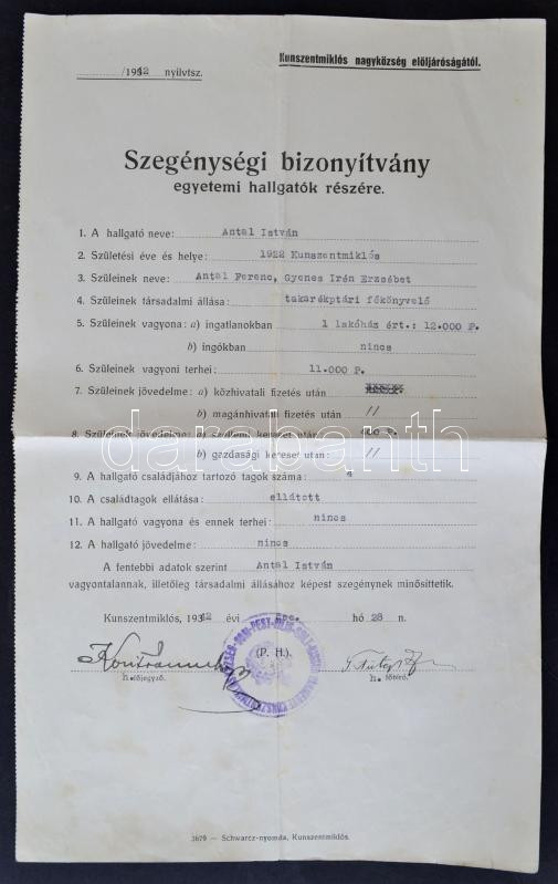 Leírás: 1942 Kunszentmiklós nagyközség elöljárósága által kiadott szegénységi bizonyítvány egyetemi hallgató részére