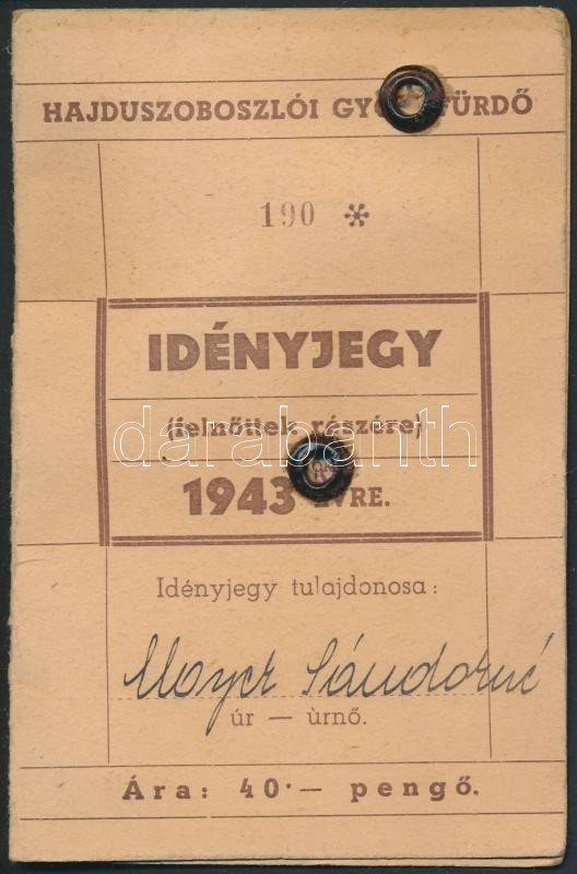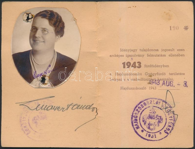 1943 a Hajdúszoboszlói Gyógyfürdőbe szóló, kitöltött, fényképes idényj... https://www.darabanth.com/hu/271-Gyorsarveres/271.0/Festmeny-mutargy-papirregiseg-egyeb/Okmanyok~17/1943-a-Hajduszoboszloi-Gyogyfurdobe-szolo-kitoltott-fenykepes-idenyjegy~II1248245