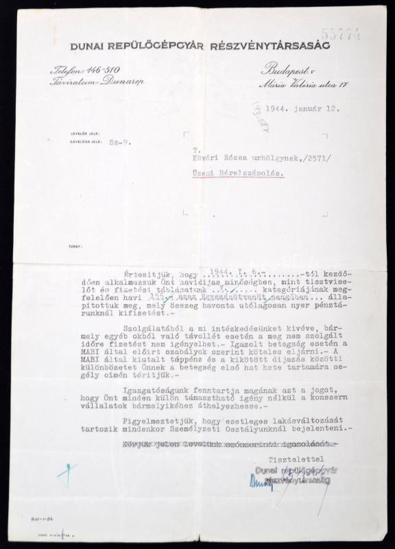 Leírás: 1944 Bérelszámolási levél a Dunai Repülőgépgyár Rt.-től, vízjeles papíron.
