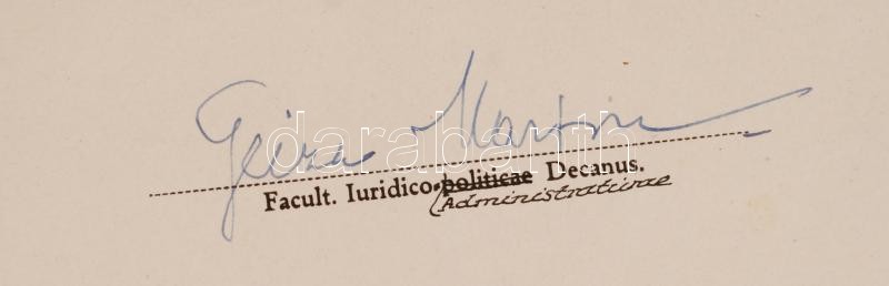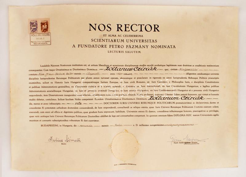 1949 Pázmány Péter Tudomány Egyetem által kiadott, jogi doktori diploma dr. Cziriák Zoltán részére, az egyetem rektorának Németh Gyulának (1890-1976) és Márton Gézának (1880-1957) az egyetem tanárának aláírásával, az egyetem szárazpecsétjével, illetékbélyegekkel, eredeti tokban, az eredeti postai csomagküldő papírban.