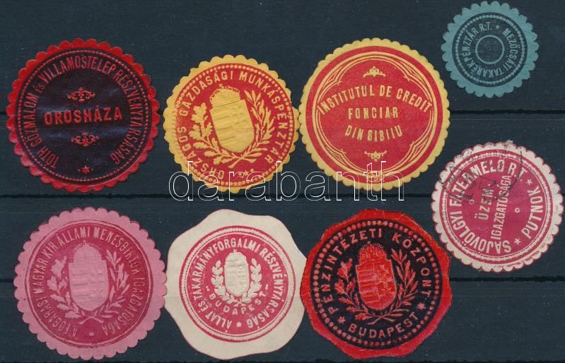 Leírás: 10 db pecsétbélyeg(Institutul de Credit Fonciar Din Sibiiu, Mezőcsáti Takarékpénztár Rt., Tóth Gőzmalom és Villamostelep Részvénytársaság, stb. )