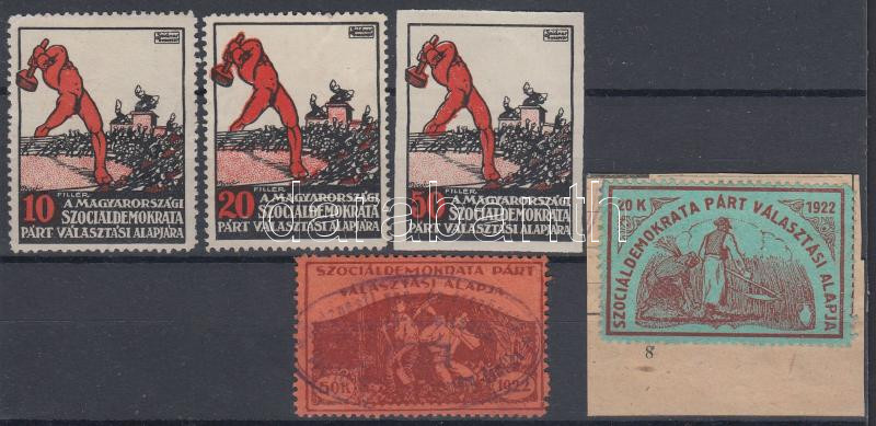 Magyarországi Szociáldemokrata Párt választási alapjára 2 db fogazott és 1 db vágott bélyeg + Szociáldemokrata Párt választási alapja 20K és 50K adománybélyeg RR!
