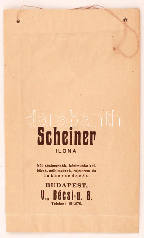 cca 1940 Bp. V. Scheiner Ilona lakberendezés reklámgrafikával díszítet... https://www.darabanth.com/hu/271-Gyorsarveres/271.0/Festmeny-mutargy-papirregiseg-egyeb/Reklam~23/cca-1940-Bp-V-Scheiner-Ilona-lakberendezes-reklamgrafikaval-diszitett-papir-reklamtaska~II1247338