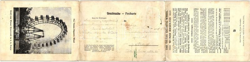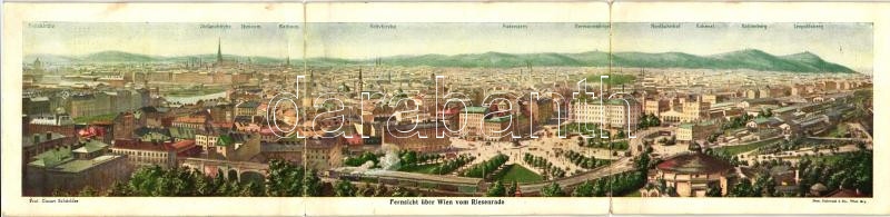Leírás: Vienna, Wien; Fernsicht über Wien vom Riesenrad / panorama from the ferris wheel, 3-tiled panoramacard, ferris wheel on the backside (bent til broken)