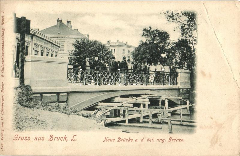 Lajtabruck, Bruck an der Leitha; Új híd az osztrák-magyar határon, Schöberl József üzlete / Neue Brücke an d. öst.-ung. Grenze / new bridge at the Austro-Hungarian border, shop (EB)