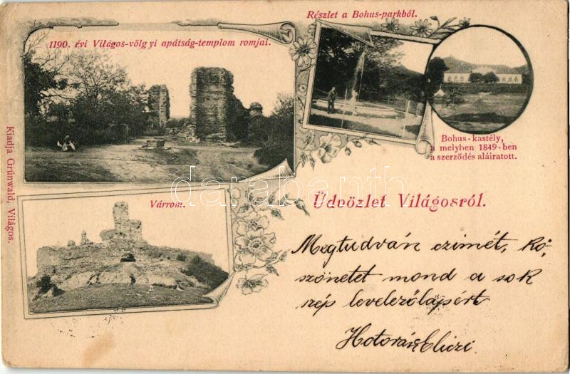 Leírás: 1899 Világos, Sina; Várrom, apátság-templomrom, Bohus kastély, park, kiadja Grünwald / castle ruin, church ruin, castle, park, floral (EK)