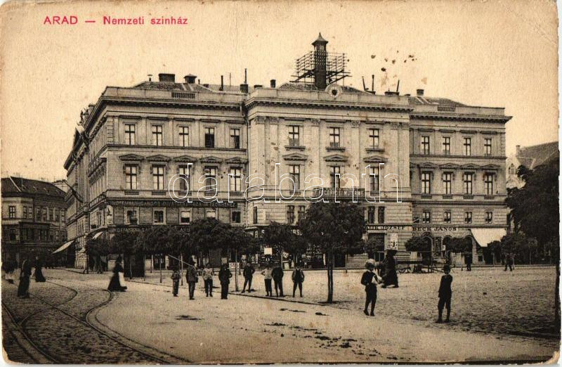 Leírás: Arad, Nemzeti színház, Hoffmann Sándor divatáruháza a fecskéhez, Vajda fogorvosi műterme, Beck János üzlete / theatre, dentistry, shops (EB)