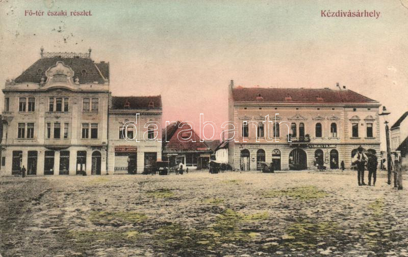 Leírás: Kézdivásárhely, Targu Secuiesc; Fő tér északi részlet, Szabó János, Vargha Vilmos üzletei, kiadja Turóczi István / main square, shops (EK)