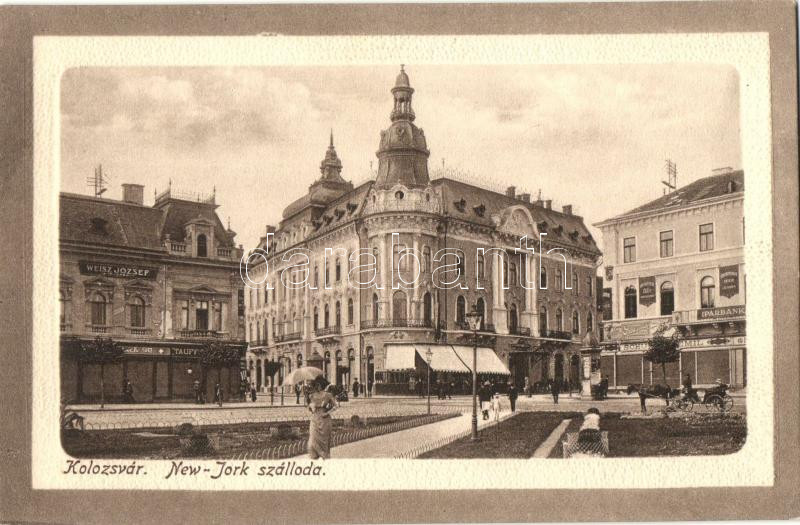 Leírás: Kolozsvár, Cluj; New York szálloda, Iparbank, Weisz József, Schuster Emil üzletei, kiadja Bernát papíros áruház / hotel, bank, shops