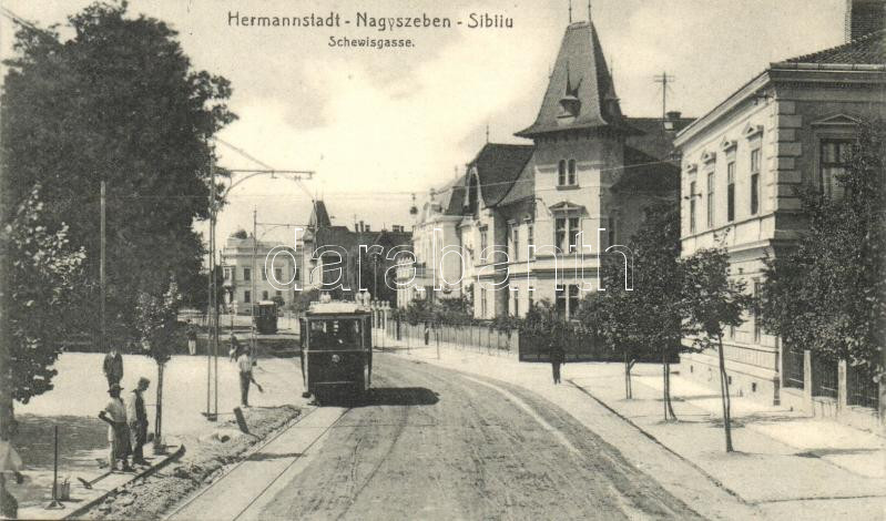 Nagyszeben, Hermannstadt, Sibiu; Schewis utca, villamos / Schewisgasse... https://www.darabanth.com/hu/271-Gyorsarveres/271.0/Kepeslapok/Erdely~200007/Nagyszeben-Hermannstadt-Sibiu-Schewis-utca-villamos-Schewisgasse-street-tram~II1369572