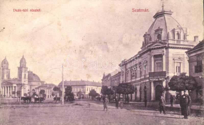Szatmárnémeti, Satu Mare; Deák tér, Paskuj Imre üzlete, Hazai Iparcsarnok, Első Magyar általános Biztosító Társaság / square, shop, insurance company (r)