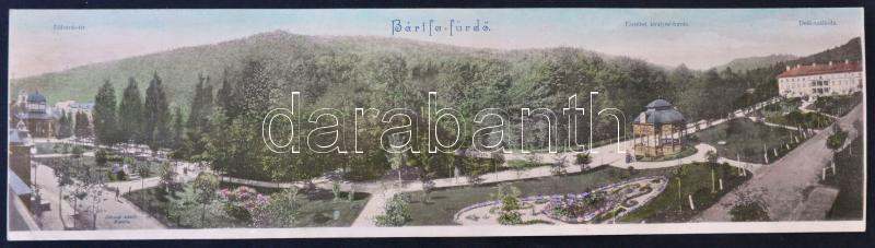 Leírás: Bártfafürdő, Bardejovské kúpele; Főforrás tér, Erzsébet királyné forrás, Deák szálloda, kiadja Divald Adolf, panoráma lap / square, spring, hotel, panorama card (non PC) (fa)