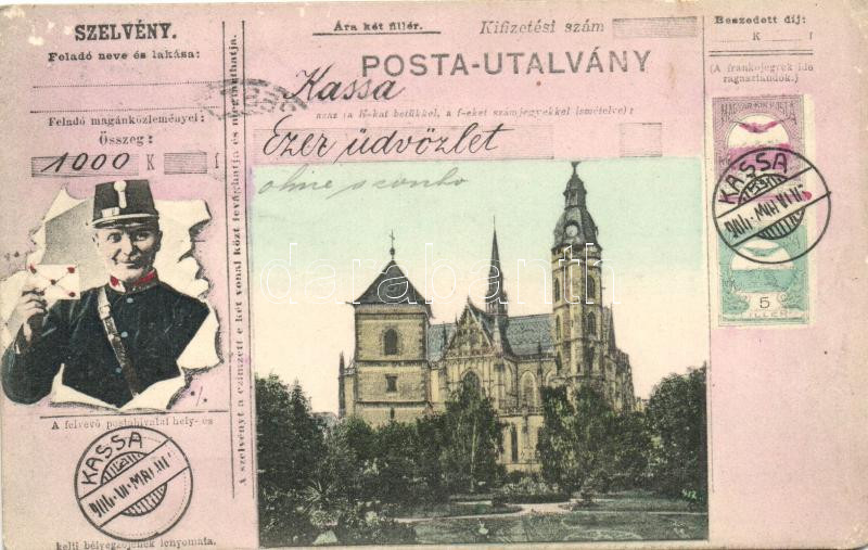 Leírás: Kassa, Kosice; Dóm, Posta-utalvány, postás, kiadja Breitner Mór / cathedral, postman (EK)