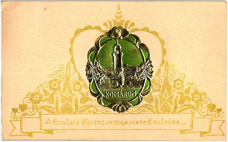 Komárom, Komárno; A Felvidék visszacsatolásának emlékére, Szeiler fémplakettes képeslap, kiadja a Felvidéki Egyetemi és Főiskolai Hallgatók Egylete / In remembrance of the liberation of northern Hungary, golden Emb. 'Máramarossziget visszatért' So. Stpl. (EK)