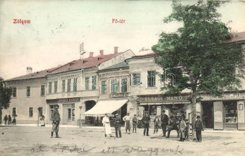 Zólyom, Zvolen; Fő tér, Jeranek Sándor, Elsasz Manó és Krompl György é... https://www.darabanth.com/hu/271-Gyorsarveres/271.0/Kepeslapok/Felvidek~200008/Zolyom-Zvolen-Fo-ter-Jeranek-Sandor-Elsasz-Mano-es-Krompl-Gyorgy-es-fia-uzlete-Hungar~II1368491
