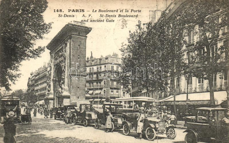 Leírás: Paris, Le Boulevard, Porte St. Denis / gate, street, automobiles (fa)