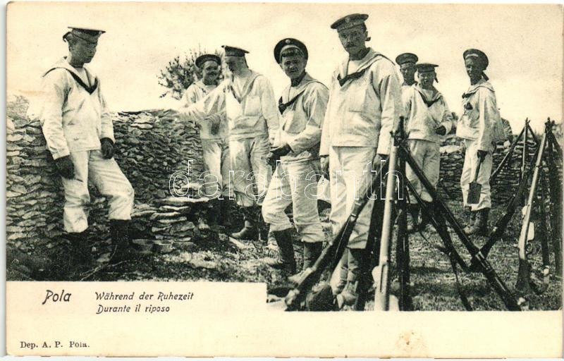 Leírás: K.u.K. haditengerészek pihenő idő közben szárazföldön / Pola, Während der Ruhezeit / K.u.K. mariners