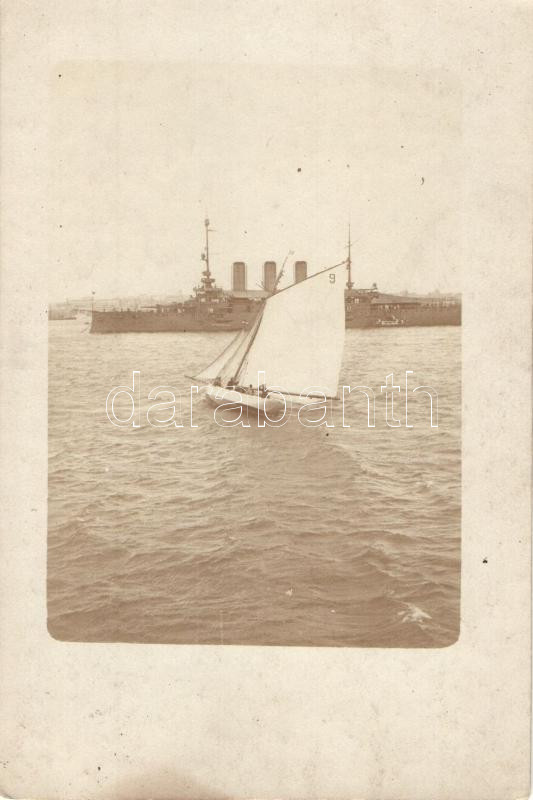 Leírás: SMS Erzherzog Karl, az Osztrák-Magyar Monarchia Erzherzog-osztályú pre-dreadnought csatahajója, előtérben vitorlás csónak / SMS Erzherzog Karl, sailing boat, photo (fl)
