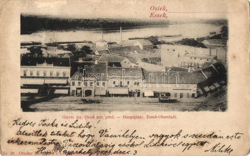 Leírás: Eszék, Osiek; Főtér, J. Bozic bútorkereskedése, söröző, Michael Raja ruhaszalonja, kiadja Ottokár Rechnitzer / main square, beer house, shops (EK)