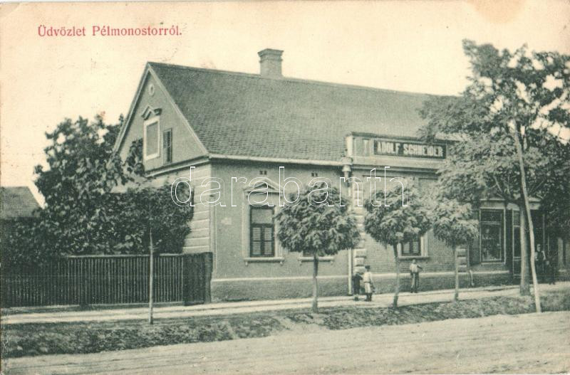 Leírás: Pélmonostor, Beli Manastir; Adolf Schneider üzlete, kiadja Adolf Schneider / shop (EK)
