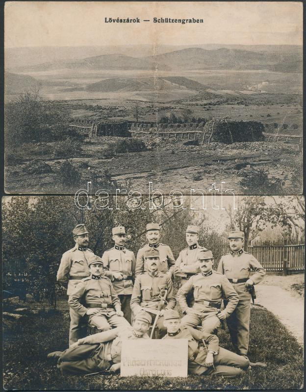 3 db I. világháborús katonai képeslap; Lövészárok, K. u. K. őrmester fotólap, német katonák csoportképe fotólap / 3 WWI military postcards; trench, K. u. K. sergeant photo, German soldiers photo