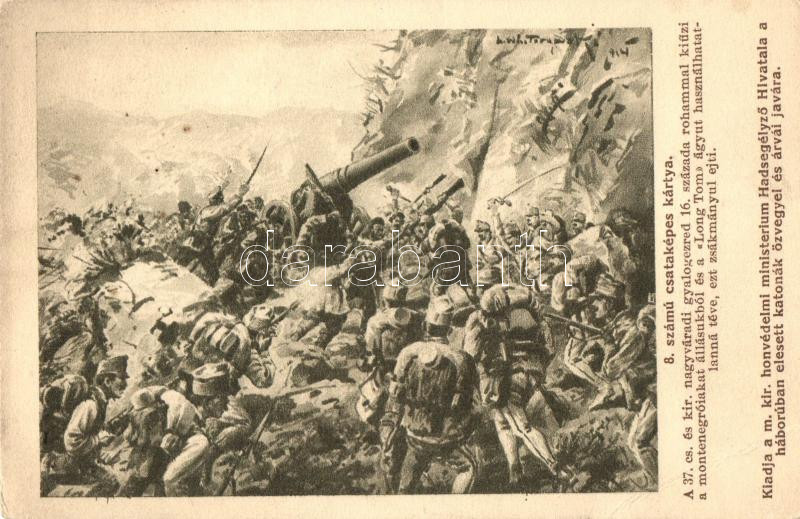 8. számú csataképes kártya; 37. cs. és kir. nagyváradi gyalogezred 16. százada kiúzi a montenegróiakat, Long Tom ágyú / WWI K.u.K. military, Montenegrin soldiers, cannon, artist signed (EB)