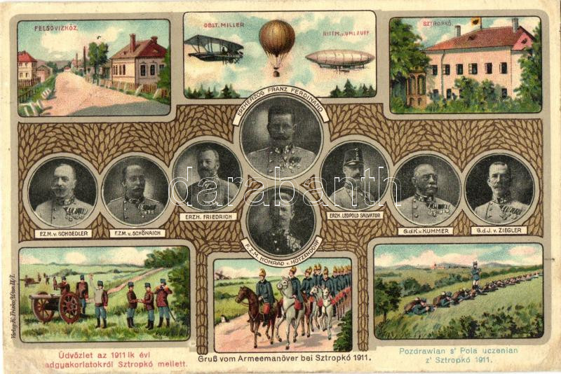 Sztropkó és Felsővízköz, Stropkov, Svidník; 1911. évi hadgyakorlatok, katonai repülő, hőlégballon, léghajó, Franz Ferdinand és katonatisztek / military maneuvers, aircraft, airship, balloon, military officers, Art Nouveau litho (r)