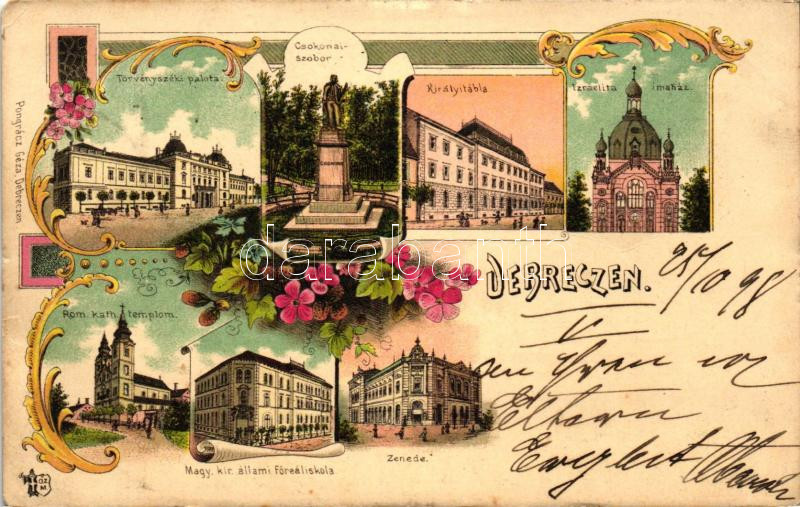 Leírás: 1898 Debrecen, Törvényszéki palota, Csokonai szobor, Királyi tábla, zsinagóga, templom, főreáliskola, zenede, kiadja Pongrácz Géza, litho (kis szakadás / small tear)