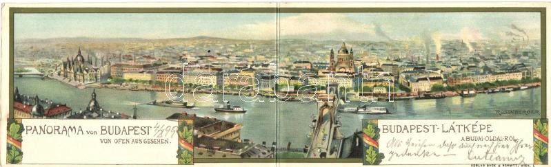 Leírás: 1899 Budapest, Látkép a budai oldalról, panorámalap, kiadja Back & Schmitt, litho, s: Rosenberger