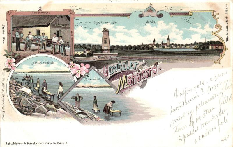 Leírás: 1899 Mohács, Lajos király szobor, Dunai malmok, korsósok, mosónők,kiadja Weiser Miksa, Schwidernoch Károly 3993. sz. floral litho (vágott / cut)