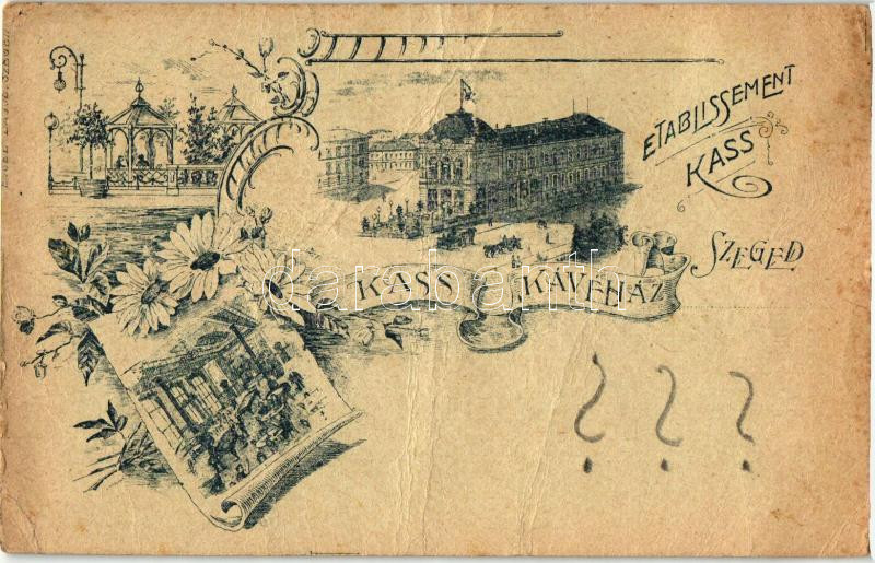 Leírás: 1899 Szeged, Kass Kávéház, belső, kiadja Engel Lajos, floral (fa)