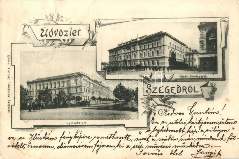 1899 Szeged, Polgári Törvényszék, gimnázium, Gönczi J. József tulajdon... https://www.darabanth.com/hu/271-Gyorsarveres/271.0/Kepeslapok/Magyarorszag~200006/1899-Szeged-Polgari-Torvenyszek-gimnazium-Gonczi-J-Jozsef-tulajdona-floral-EK~II1377827