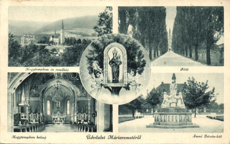 Leírás: Budapest II. Máriaremete, a Kegytemplom és rendház, a templom belseje, Szent István-kút, Főút