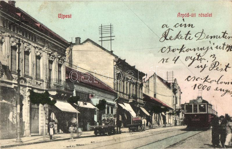 Budapest IV. Újpest, Árpád út, villamos, kiadja Selley Károly https://www.darabanth.com/hu/271-Gyorsarveres/271.0/Kepeslapok/Magyarorszag~200006/Budapest-IV-Ujpest-Arpad-ut-villamos-kiadja-Selley-Karoly~II1377128