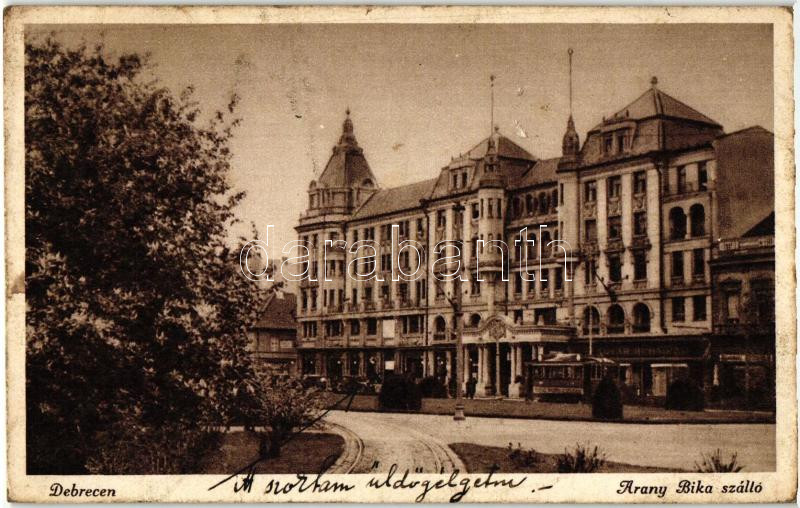 Debrecen, Arany Bika szálló, villamos https://www.darabanth.com/hu/271-Gyorsarveres/271.0/Kepeslapok/Magyarorszag~200006/Debrecen-Arany-Bika-szallo-villamos~II1375537