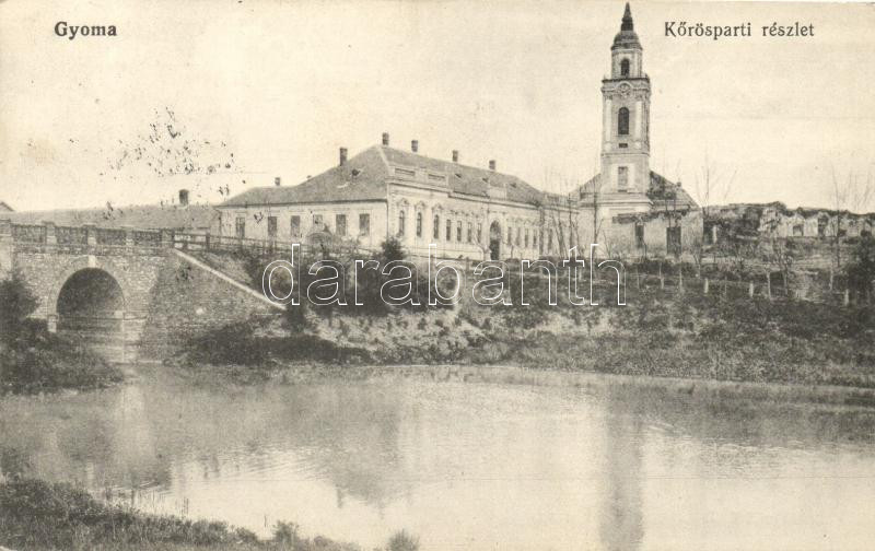 Gyoma, Kőrös parti részlet, templom, híd (fl)