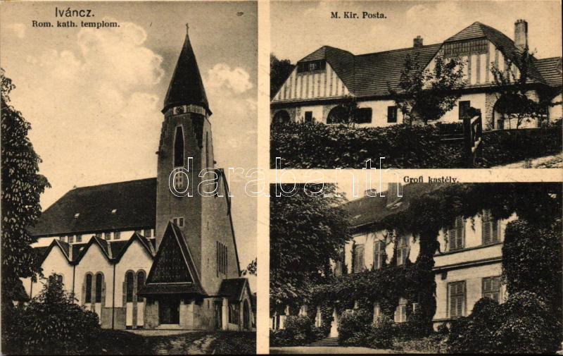 Ivánc, Római katolikus templom, Posta, Grófi kastély (vágott / cut) https://www.darabanth.com/hu/271-Gyorsarveres/271.0/Kepeslapok/Magyarorszag~200006/Ivanc-Romai-katolikus-templom-Posta-Grofi-kastely-vagott-cut~II1376041