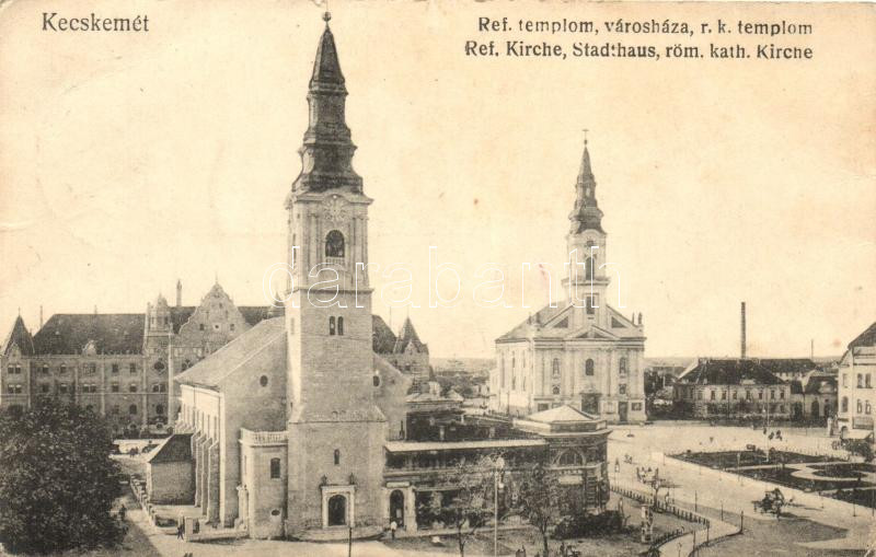 Kecskemét, Református templom, városháza, római katolikus templom, kia... https://www.darabanth.com/hu/271-Gyorsarveres/271.0/Kepeslapok/Magyarorszag~200006/Kecskemet-Reformatus-templom-varoshaza-romai-katolikus-templom-kiadja-Fekete-Soma-fa~II1369916