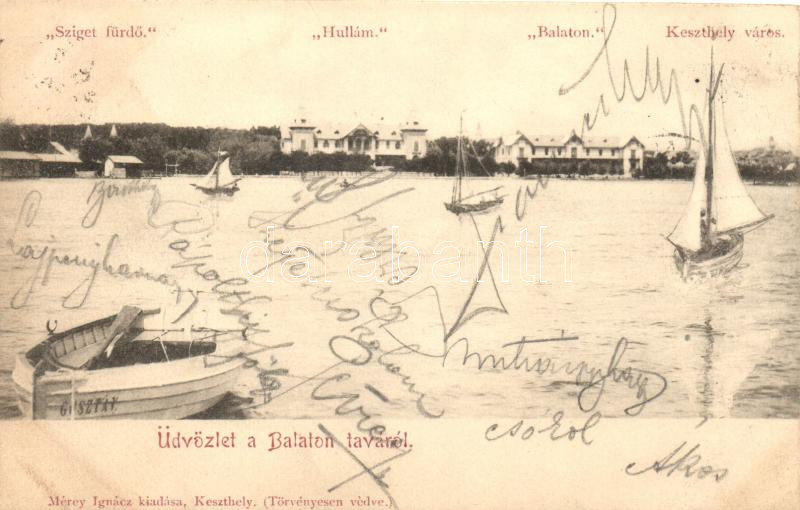 Leírás: Keszthely, Sziget fürdő, Hullám és Balaton szálloda, "Gusztáv" csónak, kiadja Mérey Ignácz (vágott / cut)